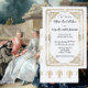 An elegant and ornate Rococo style wedding Invitation featuring a very light blue-grey shading. Double framing in gold tones, and ornate calligraphy. A special invitation for your special day. Background image is a painting by Jean-Francois de Troy 1679-1752 painted in 1831, public domain.