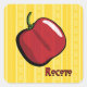 A red rocoto chili pepper is decorated with patterns inspired by the colourful textiles of Peru and sits on a yellow background with a smaller version of the same pattern and a script label in the corner. This spicy pepper is eaten in Peru and Bolivia and has been cultivated in the area since pre-Incan times.