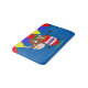 A cartoon rodeo clown in a barrel that says RODEO. There is a bull behind the clown and rodeo arena flags at the top. Printed on bathmat.