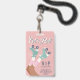 Fun pastel pink roller skating birthday party invitation VIP "All Access" badge and party favour for any age featuring "Let's Roll!" in a white script, a retro-inspired illustration of light teal roller skates on a dark-skinned girl wearing pink-striped tube socks and modern dark teal blue typography. The front serves as a badge for the girls to wear during the party. Add the invitation details on the back.
