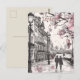 This travel postcard, in sketch illustration style, showcases a couple walking romantically in the streets of London. It is a great postcard to celebrate anniversaries for relations started in London, United Kingdom.