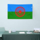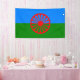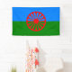 This design features the Romani flag, which is the international flag of the Romani people. The flag consists of a background of blue and green, representing the heavens and earth, respectively; it also contains a 16-spoke red chakra, or cartwheel, in the centre, which represents the itinerant tradition of the Romani people and is also an homage to the flag of India. The flag was approved by the representatives of various Romani communities at the first World Romani Congress (WRC), held in Orpington in 1971.