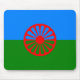 This design features the Romani flag, which is the international flag of the Romani people. The flag consists of a background of blue and green, representing the heavens and earth, respectively; it also contains a 16-spoke red chakra, or cartwheel, in the centre, which represents the itinerant tradition of the Romani people and is also an homage to the flag of India. The flag was approved by the representatives of various Romani communities at the first World Romani Congress (WRC), held in Orpington in 1971.