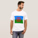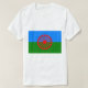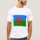 This design features the Romani flag, which is the international flag of the Romani people. The flag consists of a background of blue and green, representing the heavens and earth, respectively; it also contains a 16-spoke red chakra, or cartwheel, in the centre, which represents the itinerant tradition of the Romani people and is also an homage to the flag of India. The flag was approved by the representatives of various Romani communities at the first World Romani Congress (WRC), held in Orpington in 1971.