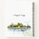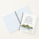Personalized notebook, journal with with inspirational quote scripture depicts a simple watercolor landscape including a house on the lake with trees and sea grass. It features an encouraging Christian Bible Verse Romans 15:13, "May the GOD of HOPE fill you with all JOY and PEACE as you trust in Him." Customize the back with a name or details of your choice.