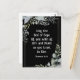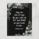 Christian inspirational quote scripture postcard depicts a simple gold frame with sage green leaves on a black background. It features an encouraging Bible Verse Romans 15:13, "May the God of Hope fill you with all JOY and PEACE as you trust in Him." The greeting, prayer can be customized or deleted for a hand written message.