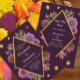 Romantic autumn dahlia wedding: Fall leaves accompany a floral frame in various shades of purple