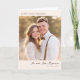 This wedding thank you card features a warm, romantic design with a central photograph of two individuals in an intimate pose, set against a soft beige background. The layout is vertically oriented, with elegant typography that includes a bold serif font for "LOVE AND THANKS" at the top and a cursive script for customizable names below the image. The colour palette consists of gentle warm tones, enhancing the affectionate mood conveyed by the golden-hued photo. Perfect for expressing gratitude after a special occasion, this card combines photographic realism with clean, contemporary styling to create a timeless keepsake.