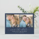 This Save the Date card features a romantic and elegant design with two photos of a couple, capturing their joyful expressions. The color palette includes soft blues and warm tones, creating a serene and inviting atmosphere. The layout is balanced, with the images framed by a navy border that highlights the central text area. The typography is stylish and modern, adding a touch of sophistication to the overall look. Perfect for announcing an upcoming wedding, this card sets the tone for a memorable celebration in Portland, Oregon.
