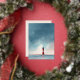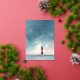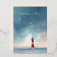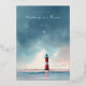 This wedding invitation features a serene and romantic design with a vertical layout, showcasing a gradient sky transitioning from soft blue to gentle pink. A striking red and white lighthouse stands prominently on calm waters, creating an ethereal atmosphere enhanced by faint seagulls in the sky. The elegant typography combines script and serif fonts, providing customizable placeholders for names, dates, and locations, while maintaining a tranquil and sophisticated mood perfect for a formal celebration.