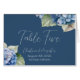 These romantic floral wedding table cards feature watercolor blue hydrangeas over a navy blue background. A delicate bouquet of hydrangea flowers is pictured on the top, and another on the bottom left. The table number is printed in an elegant font in the c enter, followed by the names of the couple and wedding date.