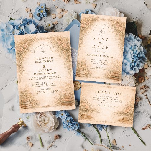 This elegant design features a beautifully detailed antique botanical composition, with delicate wildflowers, soft muted tones, and an ornate vintage frame inspired by classic book illustrations. The warm parchment background adds depth and richness, creating a timeless and refined aesthetic that feels both romantic and elevated. Perfect for couples drawn to nature, history, and understated luxury, this design brings a graceful, old-world charm to your celebration.