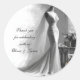 Add a refined touch to your wedding favours or stationery with this elegant round sticker. Featuring a delicate pencil sketch of a bridal gown on a mannequin, a romantic bouquet on the floor, and a soft vintage perfume bottle in pastel tones. Perfect for sealing envelopes, favour bags, or gift boxes with charm and style.