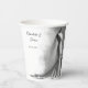 Add a touch of elegance to your wedding refreshments with this stylish paper cup featuring a delicate pencil drawing of a bridal gown on a mannequin, a vintage bouquet resting nearby, and a soft pink perfume bottle as the only coloured detail. Perfect for chic bridal showers, rehearsal dinners, or wedding receptions with a romantic black and white theme. Customizable with the couple's names and date.
