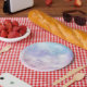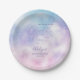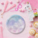 Dreamy and romantic bridal shower paper plate featuring watercolor illustration of pink, purple, and blue sky with clouds and stars.