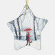 Romantic couple dancing in the snow red umbrella ceramic ornament