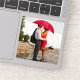 A stylish couple sharing a tender embrace under a bright red umbrella on a stone terrace—perfect romantic artwork for cards, prints, and gifts.