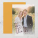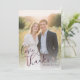 This wedding thank you card features a romantic and elegant design with a photograph of a couple standing closely together in an outdoor setting, surrounded by lush greenery and soft sunlight. The warm colour palette includes soft yellows and greens from the natural environment, contrasted with deep navy blue and light cream hues, creating a harmonious blend that evokes feelings of warmth and affection. The typography is sophisticated, with "love & thanks" written in a flowing script font at the bottom left corner, adding to the classic and timeless aesthetic suitable for formal occasions like weddings or engagements. The overall mood conveyed by the design is one of joy, love, and celebration, enhanced by the bright lighting and genuine smiles of the subjects.