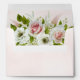 Elegant wedding envelopes invitation design featuring pink and white watercolor flowers and green foliage on a light pink background. Envelope flap is customizable with return address.