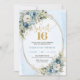 Celebrate a milestone moment with this elegant Sweet Sixteen invitation, featuring a refined watercolor design of dusty blue florals blended with soft white flowers and fresh eucalyptus greenery. Framed by a shimmering gold glitter border and paired with graceful script lettering, this invitation sets a sophisticated tone for a truly unforgettable Sweet Sixteen, Sweet 16th, or 16th birthday celebration.