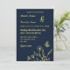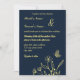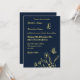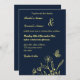 Unique simple wedding invitation featuring romantic and elegant gold flowers and a butterfly on navy background