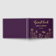 Unique simple wedding guest book featuring romantic and elegant gold flowers and butterflies on purple background