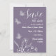 Unique simple wedding save the date invitation featuring romantic and elegant white flowers on mauve background