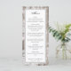 Rustic wedding menu with a vintage vibe, featuring a white romantic flower print on grey weathered wood planks.