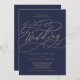 This romantic gold calligraphy navy virtual wedding invitation is perfect for a simple wedding. The modern classic design features fancy swirls and whimsical flourishes with gorgeous elegant hand lettered faux champagne gold foil typography.