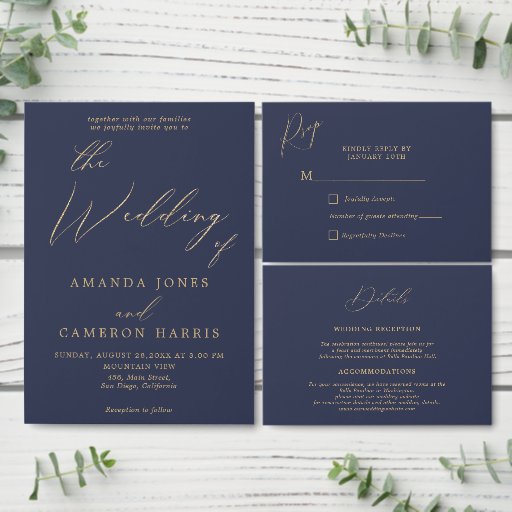 Romantic Gold Calligraphy Navy Wedding Program