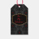 An elegant, sophisticated vintage Victorian antique goth damask design, with a red filigree goth heart. An ornate gold edged label surrounds the message"Be My Valentine" in crimson.
