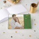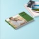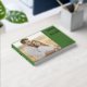 This wedding guest book features a split layout with a large photo placeholder on the left, showcasing a couple in a warm, natural setting. The right side is adorned with a bold green block that contrasts beautifully with elegant gold typography, offering customizable space for names and details. The design combines modern colour blocking with classic elements, creating a romantic and intimate mood perfect for capturing memories from your special day.