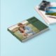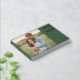 This wedding guest book cover features a split design with a warm, romantic photograph of two individuals embracing in an outdoor setting on the left, surrounded by tall grass and soft natural tones. The right side showcases a solid dark green background with elegant, modern typography in gold-yellow for customizable names and details. The layout is balanced, creating a contemporary yet rustic charm that conveys warmth and intimacy, perfect for celebrating love and special moments.