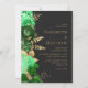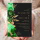 This romantic floral wedding invitation features a border of dark and light green flowers set off with gold faux foil foliage. The names of the couple appear in classic gold-coloured serif font, with the remaining text in italics, on an off-black background.