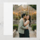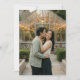 This wedding invitation features a romantic and serene design, capturing a couple embracing in front of a beautifully lit greenhouse. The color palette includes natural tones with greens from the foliage and warm yellow lights creating an inviting atmosphere. The composition focuses on the affectionate moment between the couple, set against the backdrop of lush greenery and a charming glass structure adorned with string lights. The realistic representation style enhances the genuine and heartfelt mood, making it perfect for couples seeking a tranquil and intimate wedding theme.