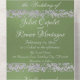 This romantic design features a sage green background with glitter borders, a delicate silver scroll heart, script in elegant fonts.  Perfect for the simple to most elegant wedding.  Also available with different coloured backgrounds for your wedding theme colours. (Glitter is simulated in the artwork).  Designed to coordinate with the "Romantic Scroll Hearts & Glitter Wedding" Collection. To change details click «Personalize». To move the text or change the text size, font, or colour click «Click to customize further»