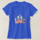 Sweet and whimsical T-shirt design featuring the word 'LOVE' in a cartoonish style. The bold letters have a soft, watercolor-like texture, with two small blue birds perched on the 'O' and 'V', looking at each other with love. Above them, a heart-shaped symbol floats, representing their affection. The 'O' includes a heart-shaped cutout, and two rosebuds grow on either side of the letters. Perfect for adding a touch of romance and childish charm to your wardrobe."