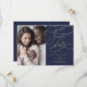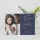 This romantic navy calligraphy photo save the date card is perfect for a simple wedding. The modern classic design features fancy swirls and whimsical flourishes with gorgeous elegant hand lettered faux champagne gold foil typography.