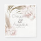 This elegant and romantic wedding or engagement party napkin features a tropical boho floral design. A bouquet of flowers with blush coloured orchids, pampas grass, and palm leaves are pictured in the top right and bottom left.