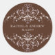 Romantic antique ornaments in white against a rich brown background serve as a framework for this sticker. Fully customize it with your own name(s) and event date. Stick it on envelopes or correspondence, seal favour bags, label boxes, etc. A sticker suitable for any occasion: weddings, engagement parties, a save-the-date or a corporate event. Available in alternate colours with matching products.