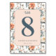 This wedding table card features a soft peach central panel with the number "8" in bold, navy blue font, surrounded by an elegant floral border of roses and peonies in muted tones. The design combines a romantic vintage aesthetic with modern typography, using a mix of script and sans-serif fonts for a sophisticated look. Perfect for adding a touch of charm to your special day, this card is ideal for creating a warm and inviting atmosphere at your wedding reception.