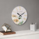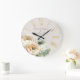 This romantic floral wall clock features an elegant ivory colour background with watercolor ranunculus flowers. A delicate bouquet of peach and white coloured ranunculus is pictured on the bottom. The names of a sample newlywed couple and wedding date are printed above. You can personalize the clock to include your own custom names or text. The numbers are printed in a gold foil Roman numeral design.