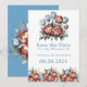 A beautifully illustrated bouquet of flowers. The bouquet consists of large, vibrant peonies in shades of terracotta and blue, complemented by smaller blue tulips. There are also green leaves and golden accents, possibly representing stems or other floral elements. The flowers are centrally positioned, with a pair of intertwined golden rings placed amidst them. The entire composition is set against a white background, emphasizing the colours and details of the flowers.