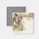 Adorable vintage illustration of a pig in top hat riding a bike and carrying a bouquet of flowers to his girlfriend who is looking over a wall and holding a pretty fan