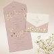 This romantic all-in-one wedding invitation features a blush pink backdrop adorned with delicate gold wildflowers. With a built-in RSVP panel and elegant script, it’s a beautiful and functional option for rustic, botanical, or modern boho weddings. Pre-folded and ready to mail—no envelope required.