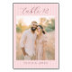 This wedding table card features a romantic and elegant design with a soft pastel pink background adorned with subtle vertical stripes. The layout includes a large photo placeholder of two individuals in an outdoor setting, surrounded by tall grasses during sunset or sunrise, creating a warm and inviting atmosphere. The text "table 12" is elegantly displayed in cursive script at the top, while the names are presented in bold serif font at the bottom, both in a deep mauve colour that contrasts beautifully with the light background. The overall mood is one of warmth and celebration, making it perfect for formal events.