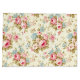 Lovely and romantic feminine seamless floral pattern featuring sprays of pink roses and blue flowers with sage foliage on pale pastel yellow background.