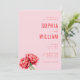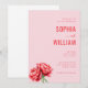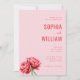 This elegant wedding invitation features a soft pink background with delicate floral illustrations of peonies in the bottom left corner, adding a romantic touch. The layout is clean and minimalist, utilizing centred alignment for easy readability, with customizable text fields for names, dates, and locations. A mix of script and sans-serif fonts enhances the sophisticated yet whimsical theme, creating an inviting atmosphere perfect for celebrating love. The design's warm colour palette and watercolor-like effects evoke a sense of joy and celebration, making it ideal for a memorable wedding event.