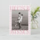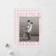 Photocard on pink coloured plaid pattern with large Hugs & Kisses written top and bottom covering partly the photo.