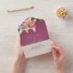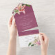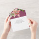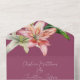 This romantic floral wedding invitation features an all-in-one design with an R.S.V.P. card included at the bottom. The background is an elegant fuchsia, with watercolor pink and white lilies. A delicate bouquet of lily flowers and greenery is pictured on the front flap, and two on the inside portion.